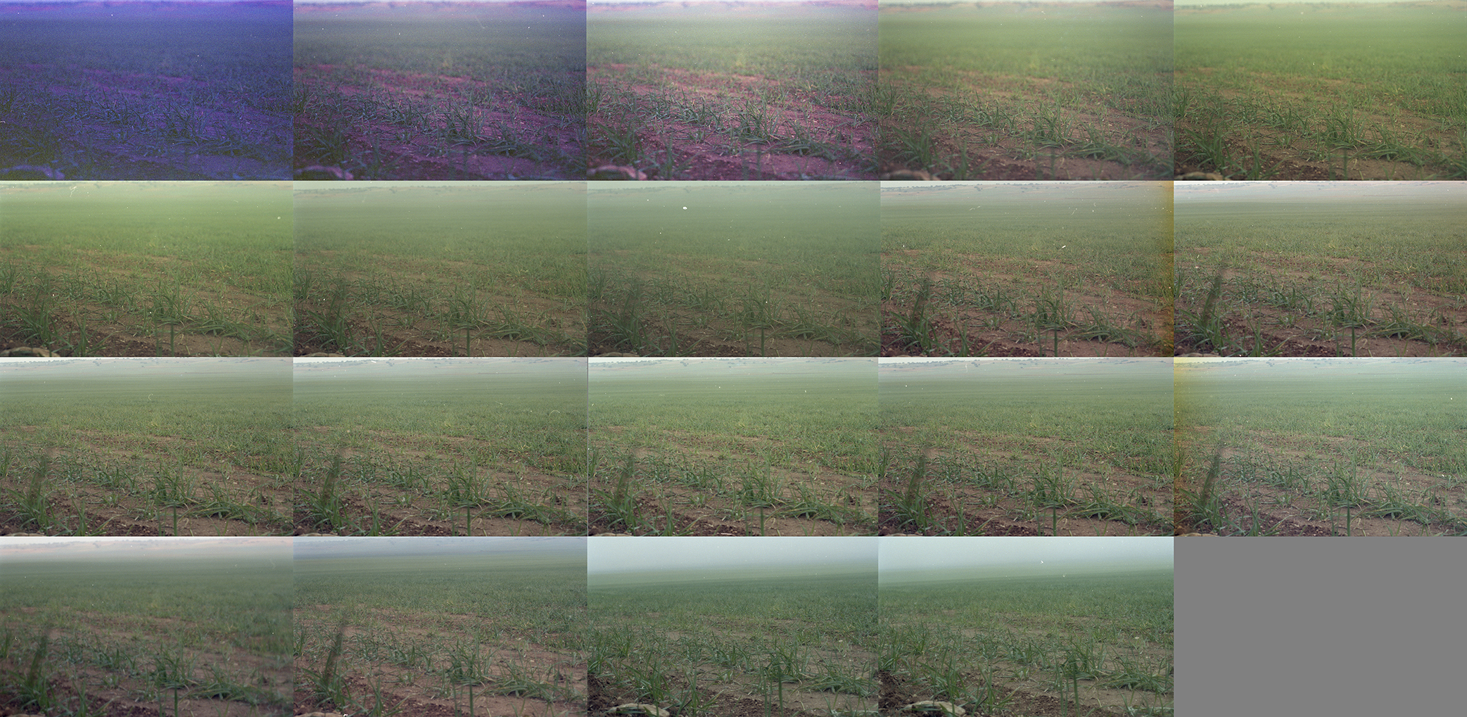 Secuencia fotográfica compuesta por 19 imágenes. Cámara fija, disparos aleatorios siguiendo los cambios de luz. Negativo a color positivado, 35mm. Kodak. La Manchuela, Cuenca, 2000