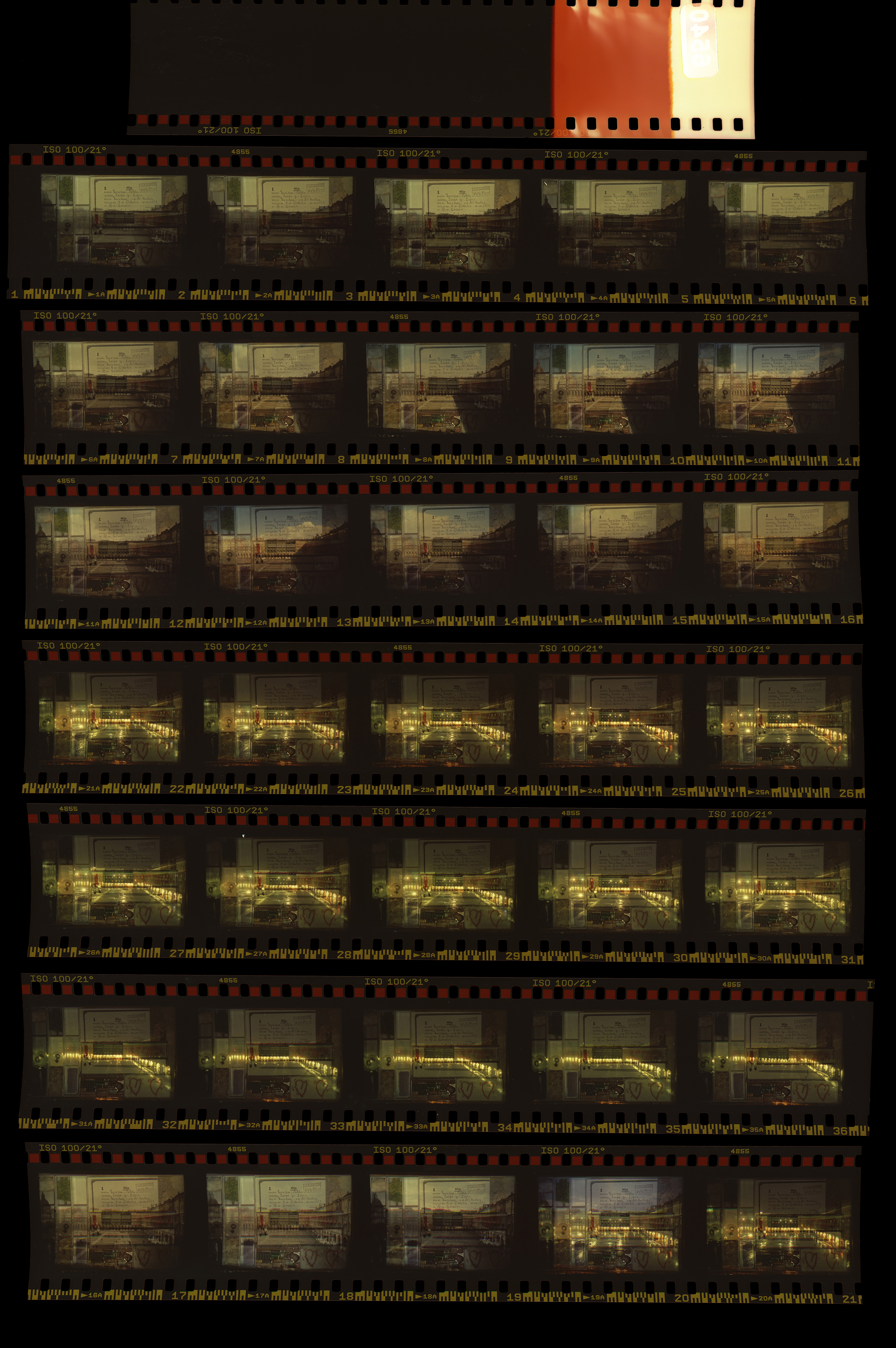 Proyección fotográfica sobre soporte mixto (Collage analógico). Contactos, negativo a color positivado 35mm., Kodak Kodacolor VR 100 35mm.
